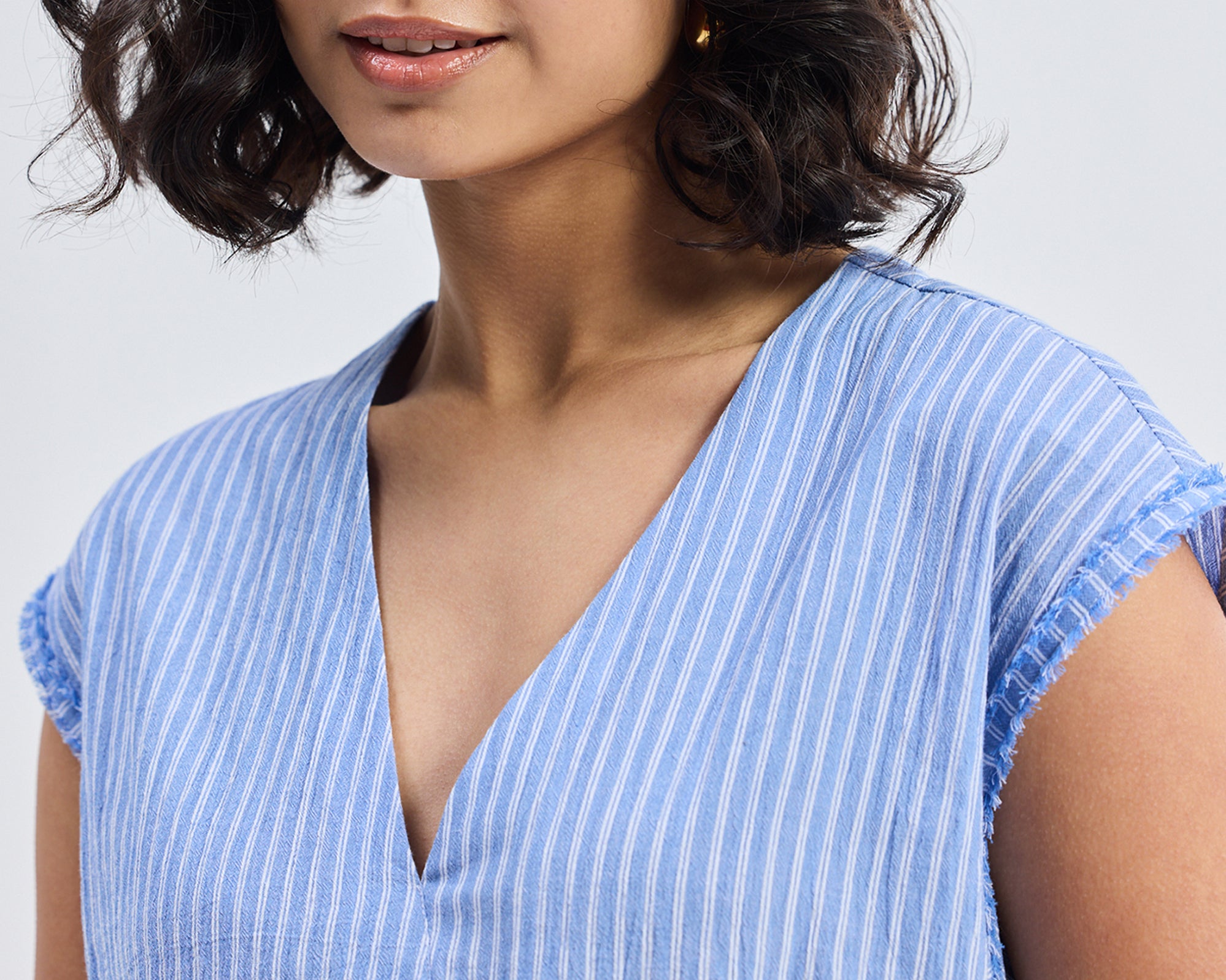 A classic piece with a relaxed, boxy fit, this pretty, striped top is stylish, comfortable, lightweight, versatile, and crafted from 100% cotton for all-day comfort. The subtle fray detail adds a touch of effortless charm, making it perfect for lounging, casual outings, or everyday wear.