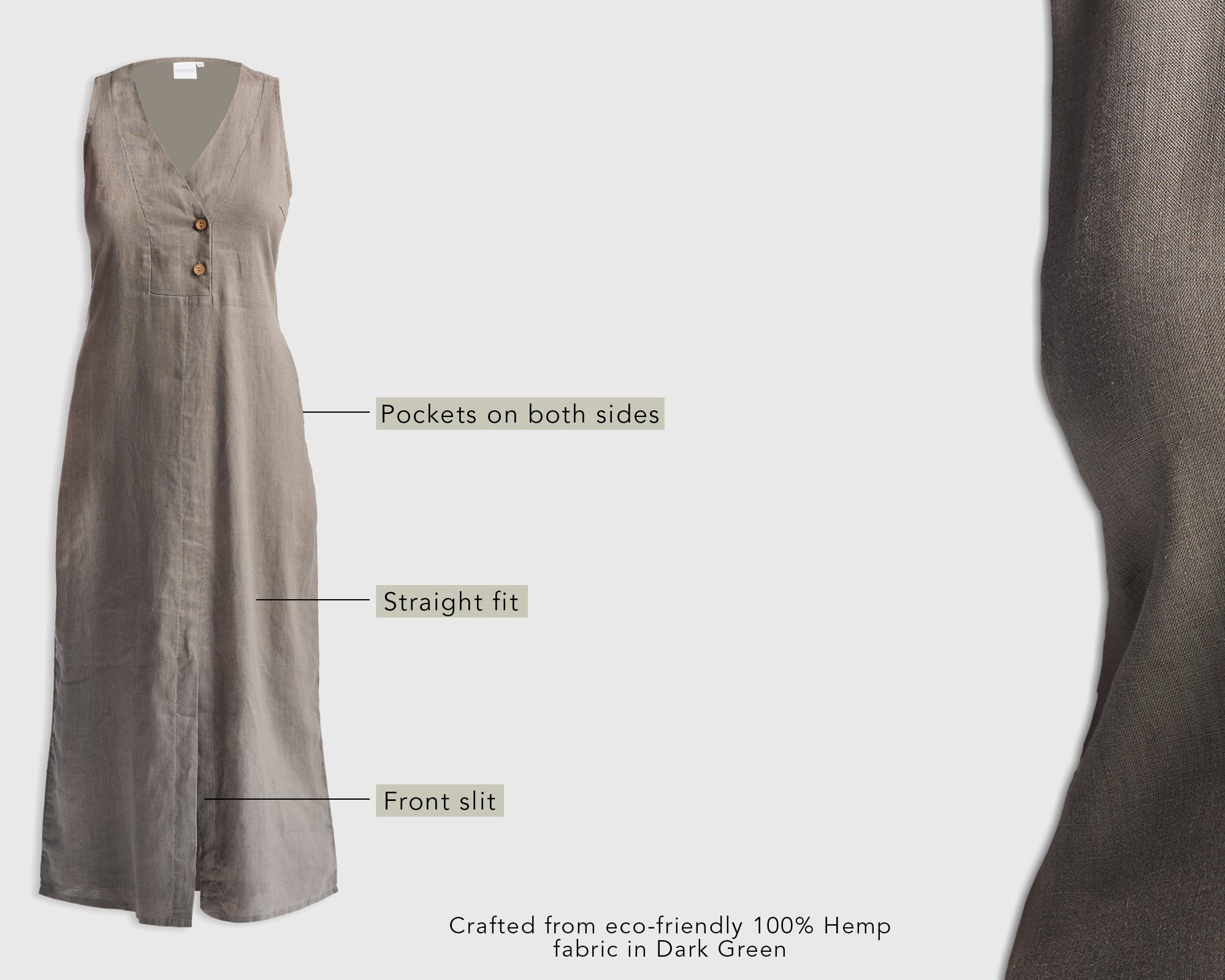 An upgraded work dress, this straight 100% hemp dress in dark green is lightweight, breathable and extremely comfortable. It feels great against your skin and can easily be dressed up for dinner after work. It’s elegant, bold, stylish, comfortable, and endlessly versatile!