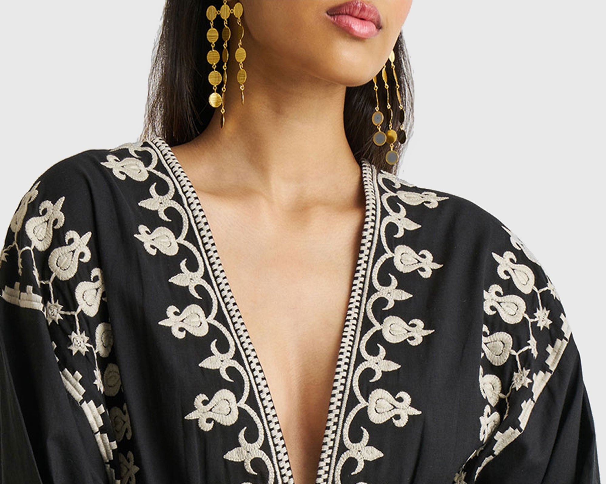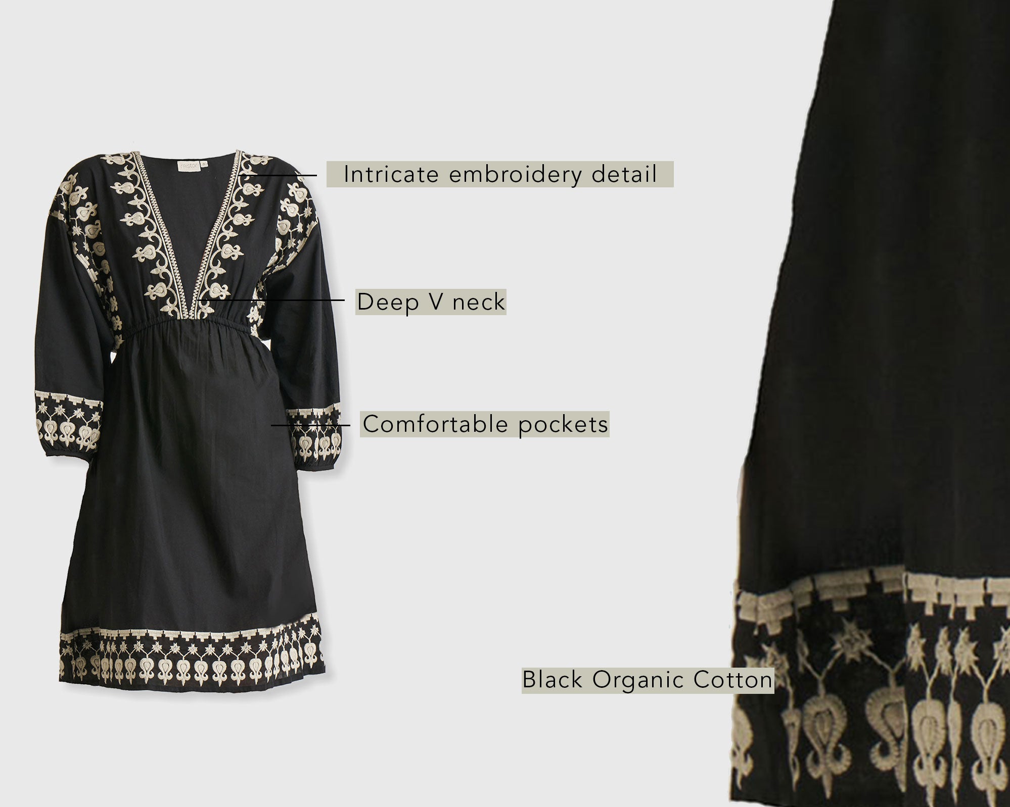 A classy and sophisticated dress, this cotton outfit features eye-catching embroidery and a deep v-neck.
