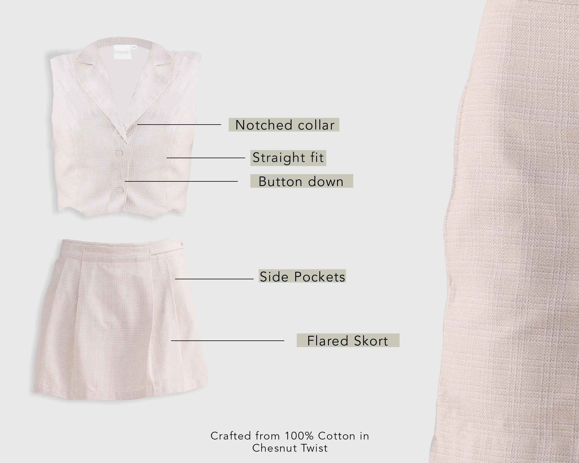 Consciously crafted for a tailored yet comfortable fit, this cropped vest set adds effortless sophistication to your wardrobe. The vest features a button-down design with a notched collar and a versatile skort. The pleated front and side pockets of the skort add both charm and functionality. This set offers endless styling options, from a sophisticated look to a more casual vibe.
