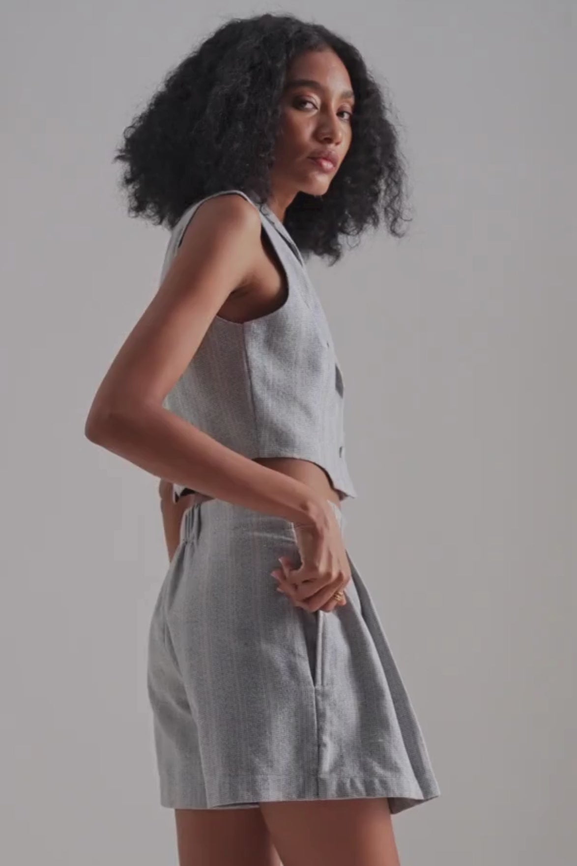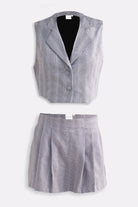 Designed for a tailored yet comfortable fit, this cropped cotton tweed vest set in grey adds effortless sophistication to your wardrobe. The vest features a button-down front with a notched collar and a matching skort. The pleated front and side pockets add charm and practicality, making it ideal for any occasion. This set offers versatile styling options, from a sophisticated look to a more casual vibe.