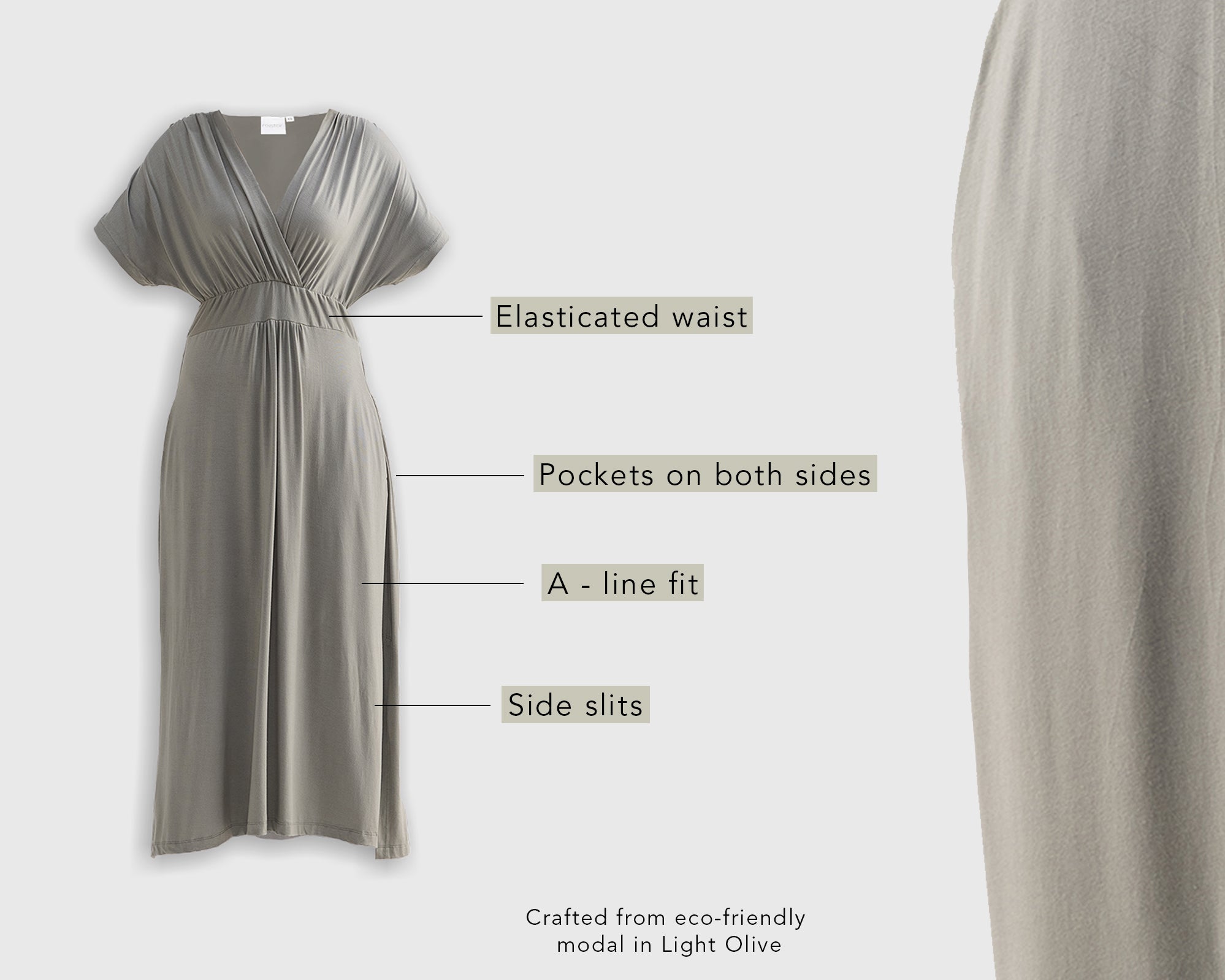 Once you try on this flowy maxi dress, you might never want to take it off! Made from an eco-friendly modal fabric, this piece feels like butter against your skin, in a flattering light olive shade, and looks as good as silk.