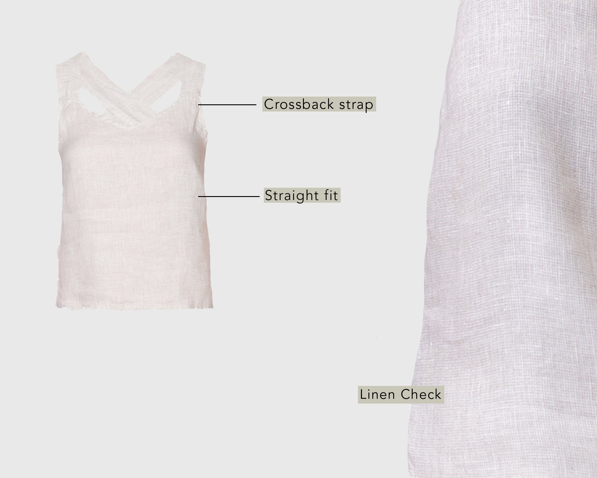 A Straight fit tank top with bold crossback straps which button up in front. This cropped top is great for lazy days wandering in new cities or while meeting up with friends and family.