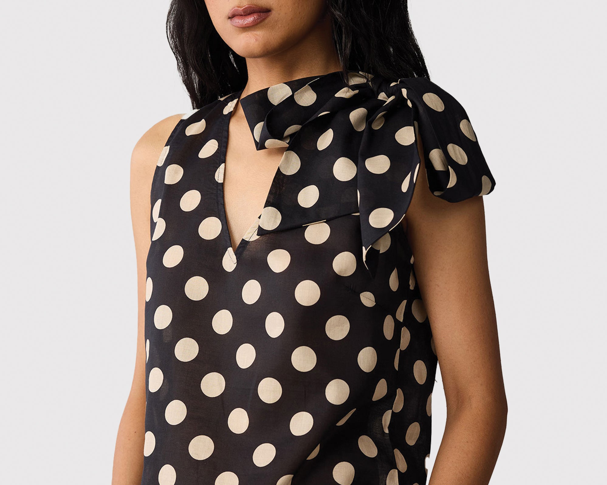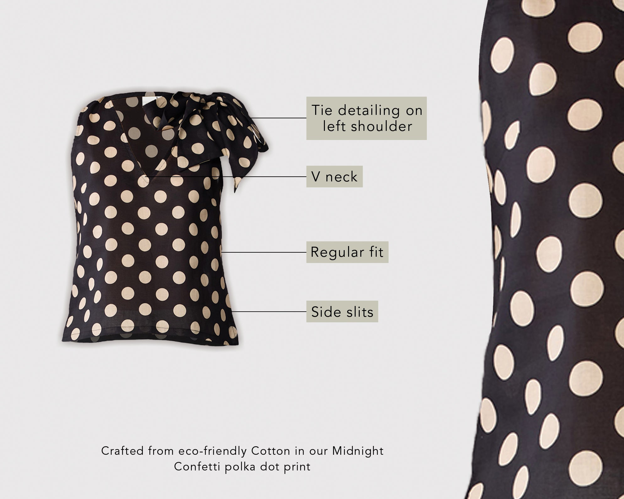 Here’s a stylish, comfy, easy polka dot top with a timeless feel. Made from 100% cotton, it’s soft, breathable, and perfect for all-day wear. The classic print, V-neck, and playful tie-up straps (which you can tie as you like) add just the right charm, making this piece easy to style for everyday plans, weekends, travel, or casual get-togethers.