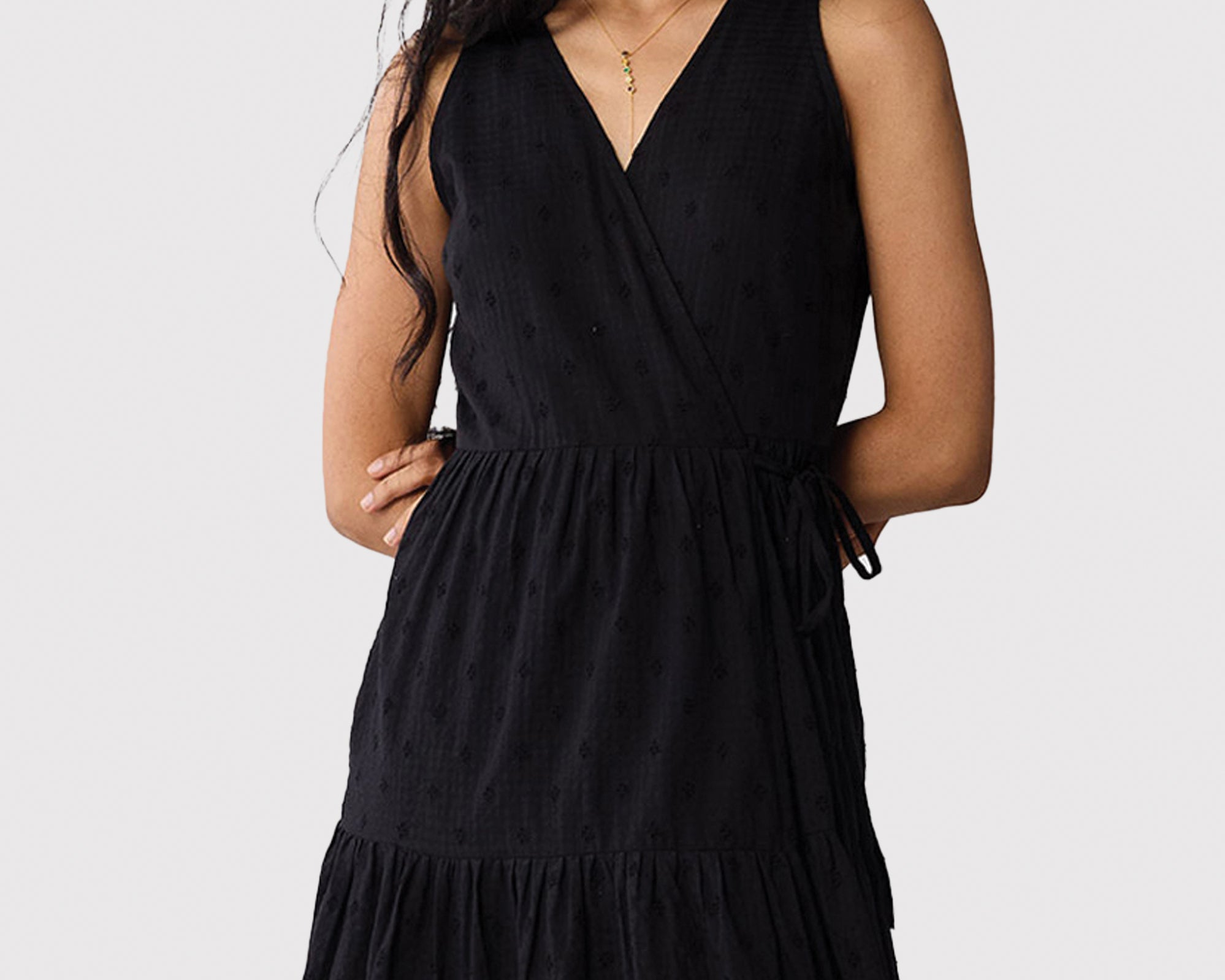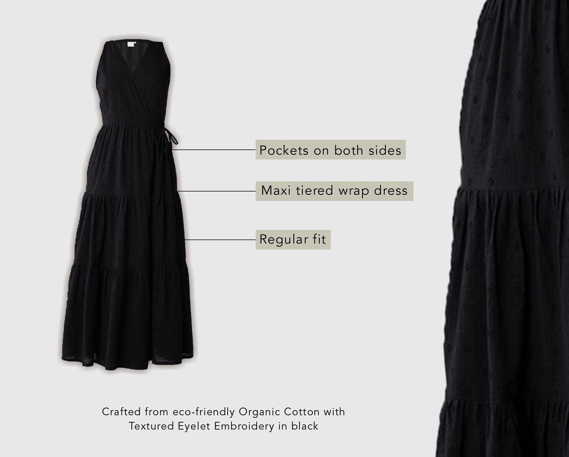 Sleeveless Embroidered Wrap Dress with Tiers in Black