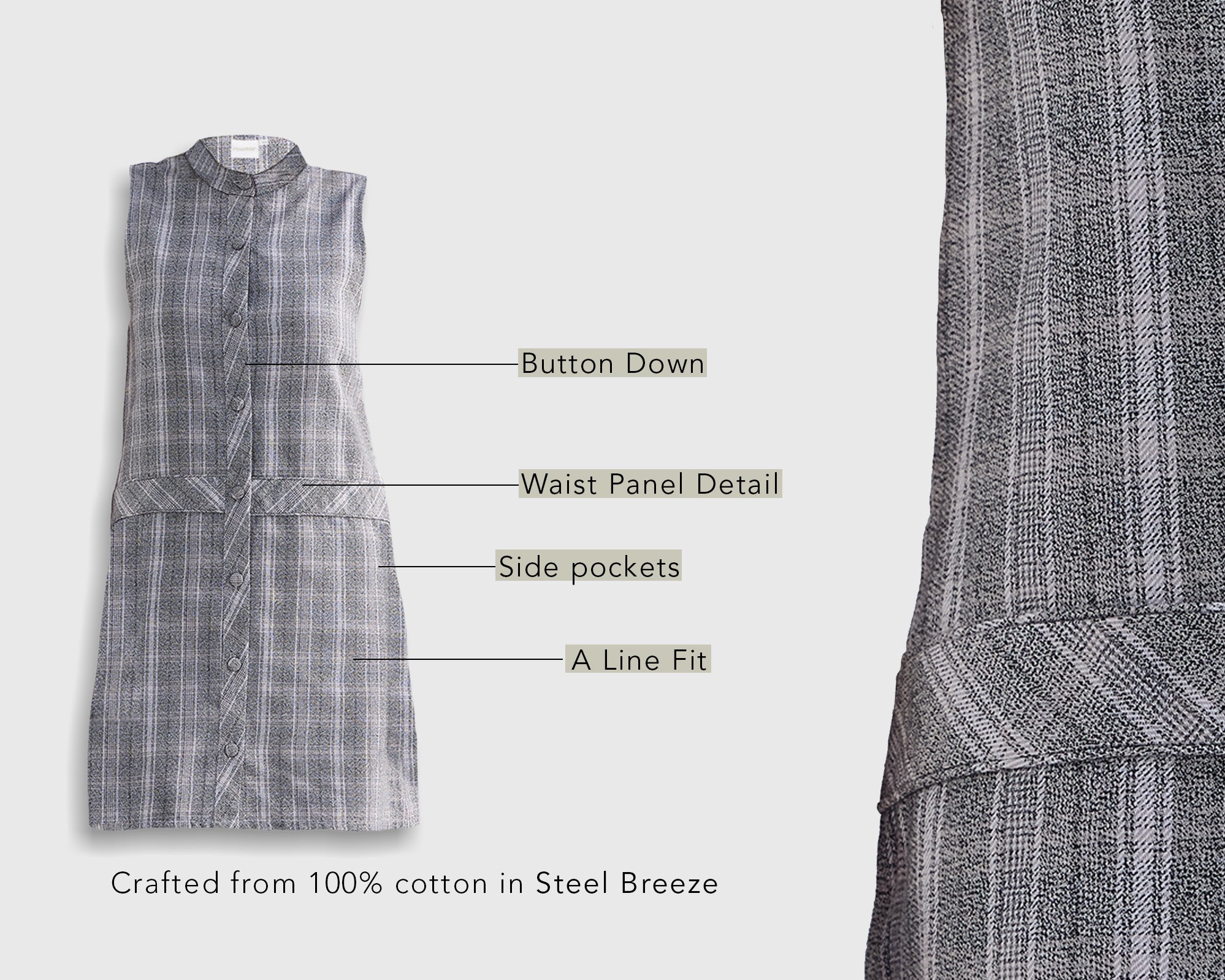 Effortlessly elevate your wardrobe with our sophisticated shift dress in cotton tweed, a timeless piece designed to bring a touch of nostalgia and charm to any occasion. The gentle A-line finish of this button-down dress and its side pockets, coupled with the delicate detailing across the waistline is just what you need to stylishly make it through your day.
