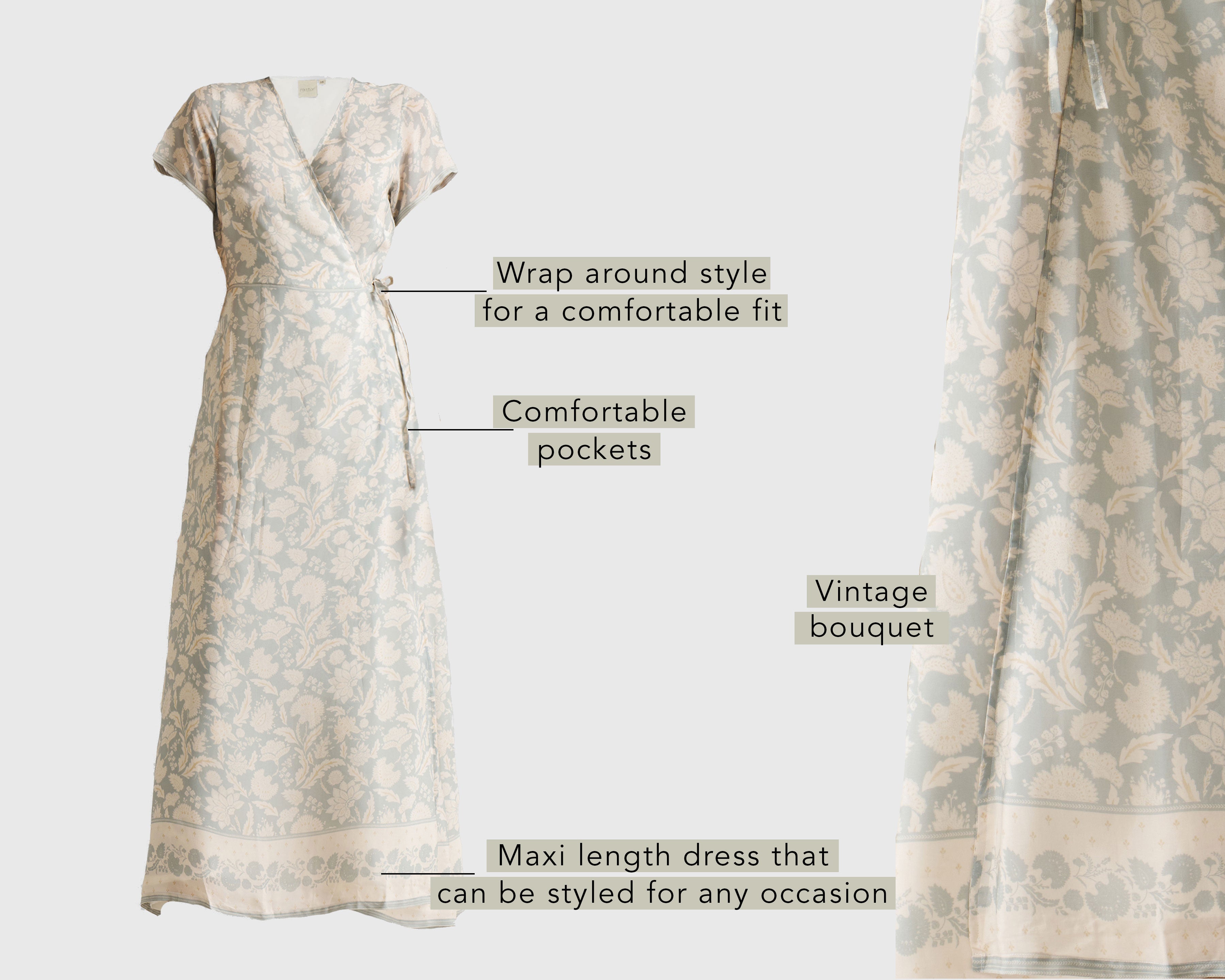 The beautiful subtle blue color of this wrap dress and its romantic floral print makes it perfect for dinner dates, parties, brunches, and casual outings. Inspired by muted hues, this chic wrap dress is perfect for cool evenings and lazy afternoons.