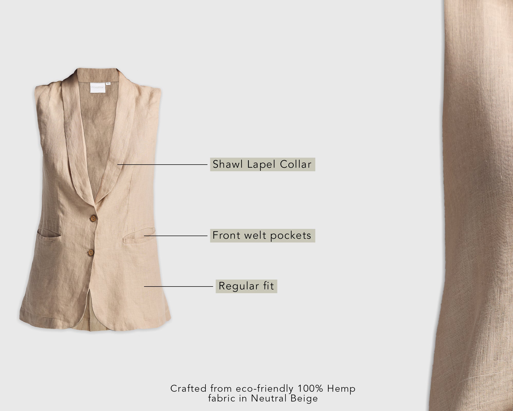 Our 100% hemp sleeveless jacket is the perfect blend of style and sophistication. Wear this classic neutral piece with a cropped tank top underneath or a lacy bralette for added style. From work to weekends, this blazer will always have you covered in effortless style!