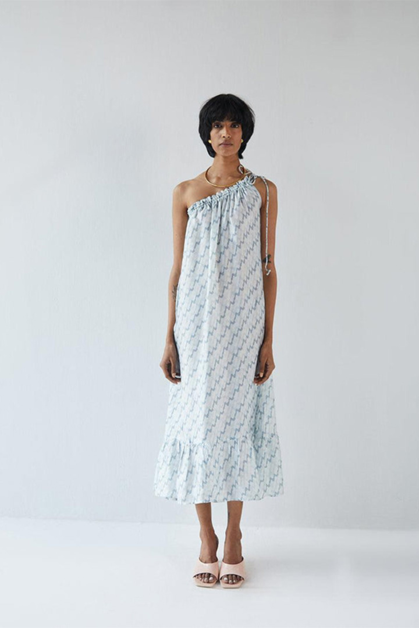 A one-shoulder dress with a drawstring neckline, this flowy, breezy silhouette is flattering and comfortable. Take this piece dancing or to dinner, it looks great doing both!
