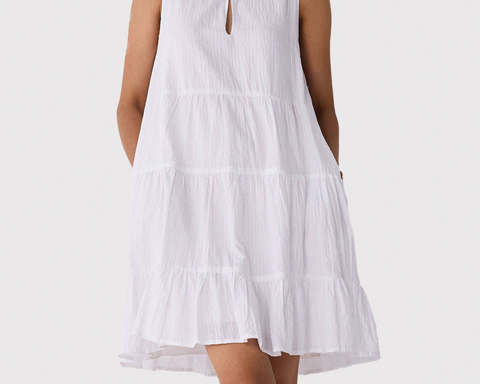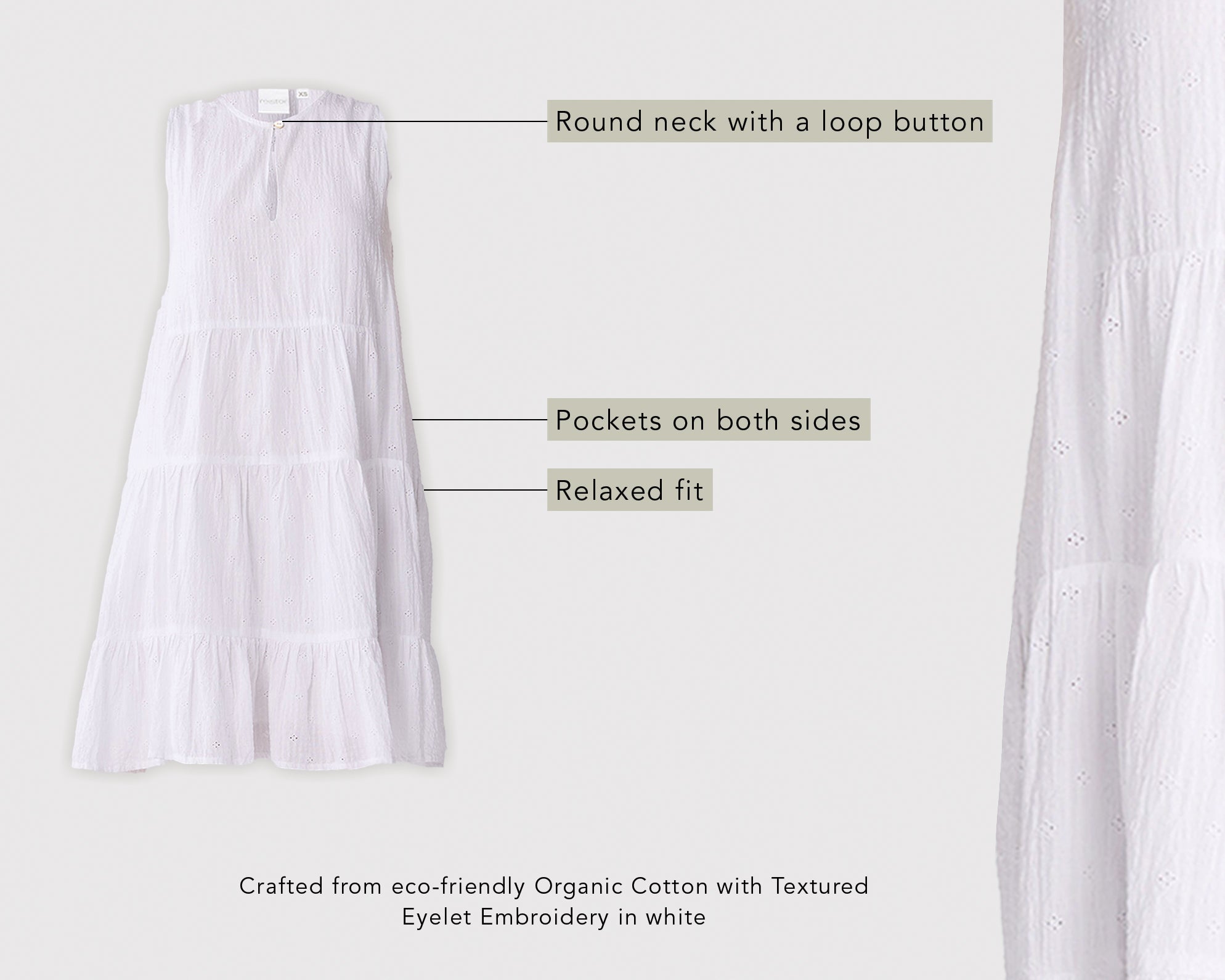 This stylish white resort dress is all about easy wear; the perfect vacation wardrobe staple designed for maximum comfort and style. The soft, breathable cotton fabric feels light on the skin and keeps you chic through the day. Purposefully designed in a relaxed silhouette and sleeveless cut, this dress is all you need to stay stylish and comfy on vacation.