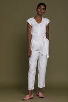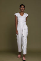 Get brunch ready with this modern V-neck jumpsuit with micro sleeves and straight-cut legs for a voguish look day or night!