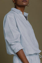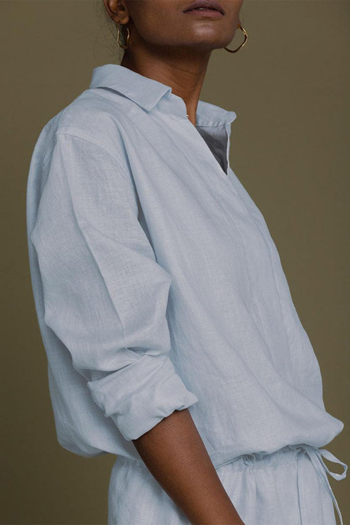 Subtle sophistication and contemporary style come together in this oversized, collared shirt dress in blue with a front pocket and adjustable drawstring.