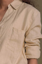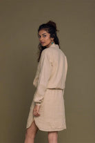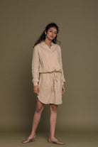 Subtle sophistication and contemporary style come together in this oversized, collared shirt dress in Neutral beige with a front pocket and adjustable drawstring.