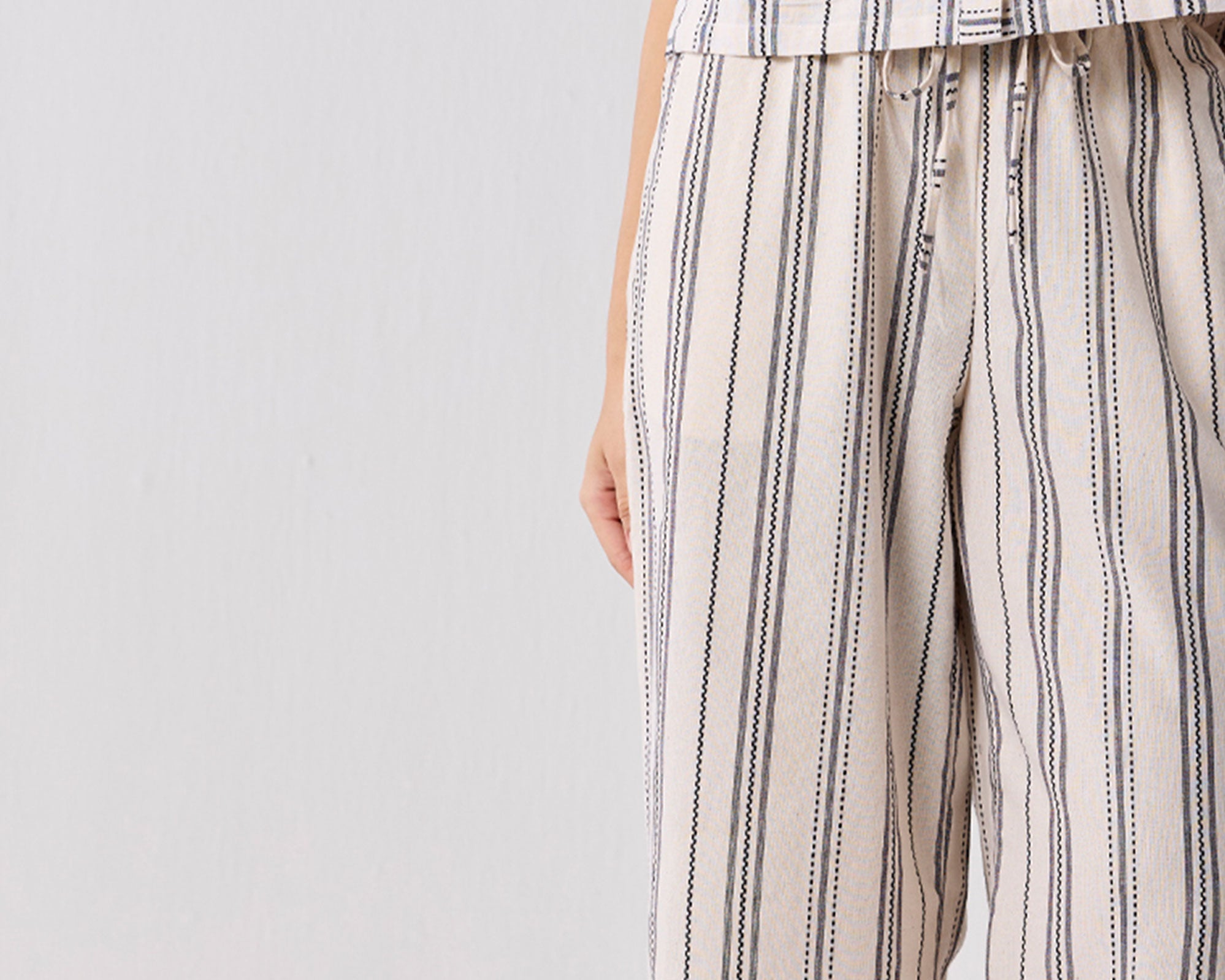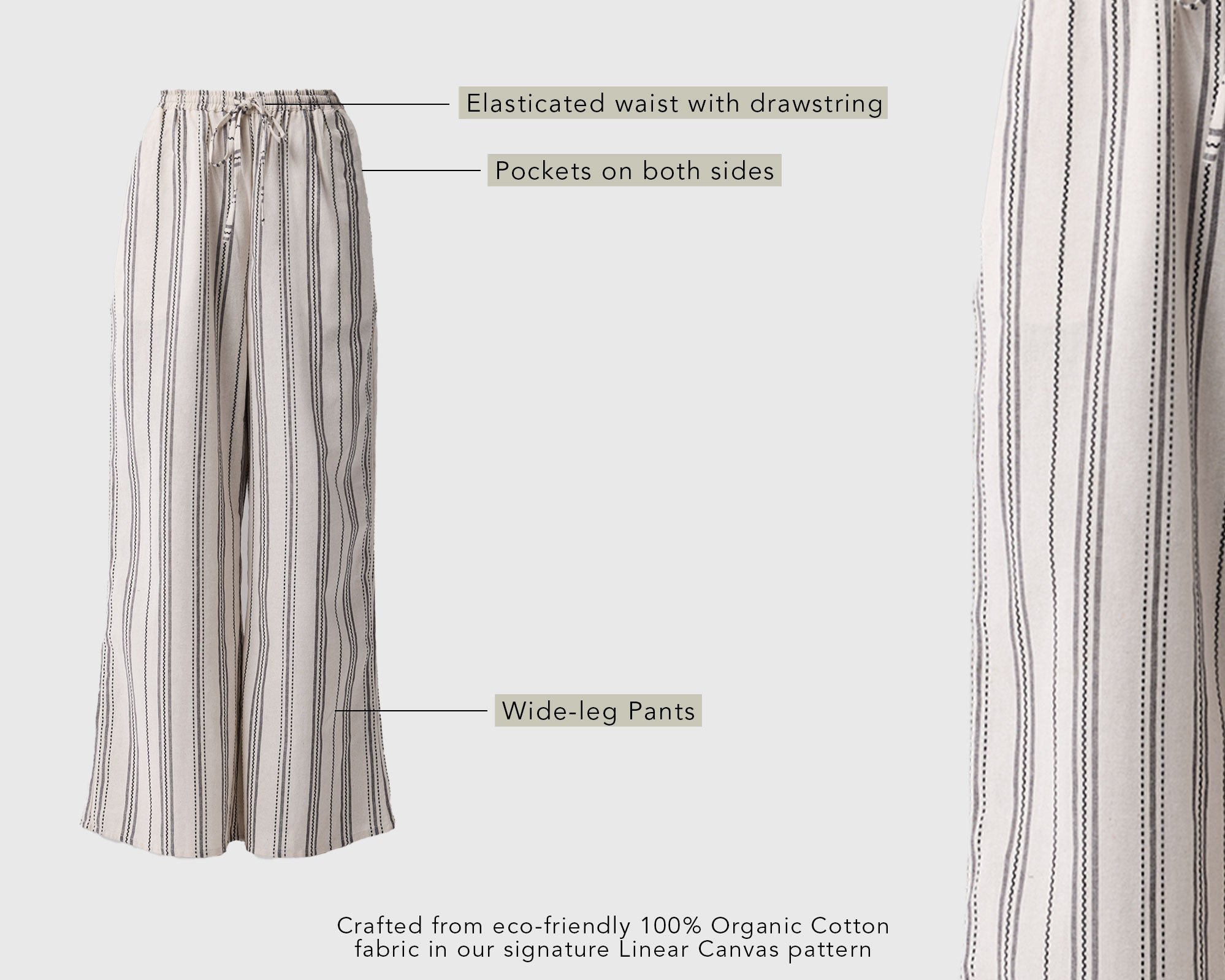 These 100% organic cotton wide-leg pants in classic stripes come with a comfy elasticated waist, adjustable drawstring, and side pockets. Perfect for daily wear, semi-formal plans, or just styling your way, because versatile basics never go out of style.