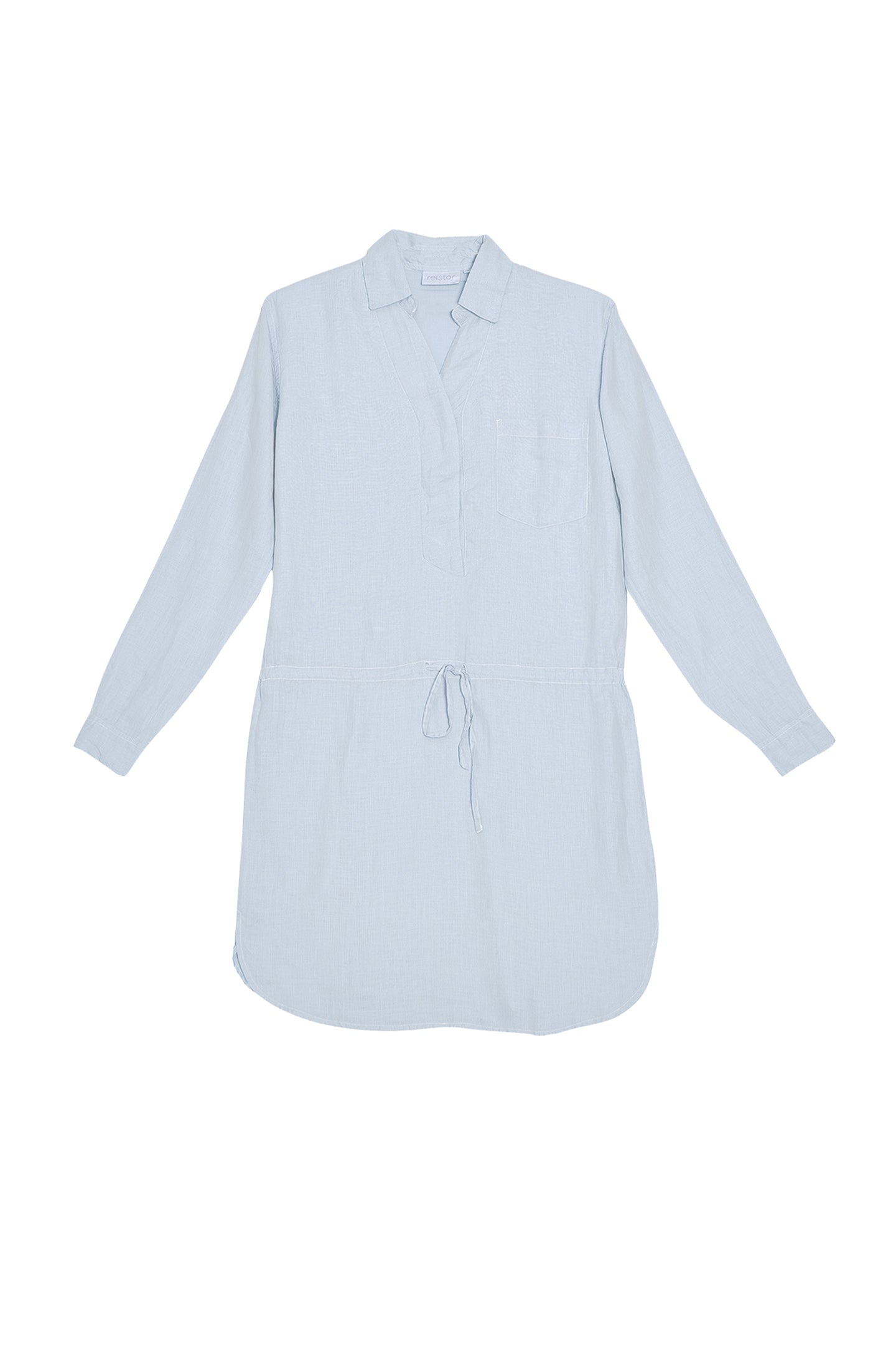 Subtle sophistication and contemporary style come together in this oversized, collared shirt dress in blue with a front pocket and adjustable drawstring.