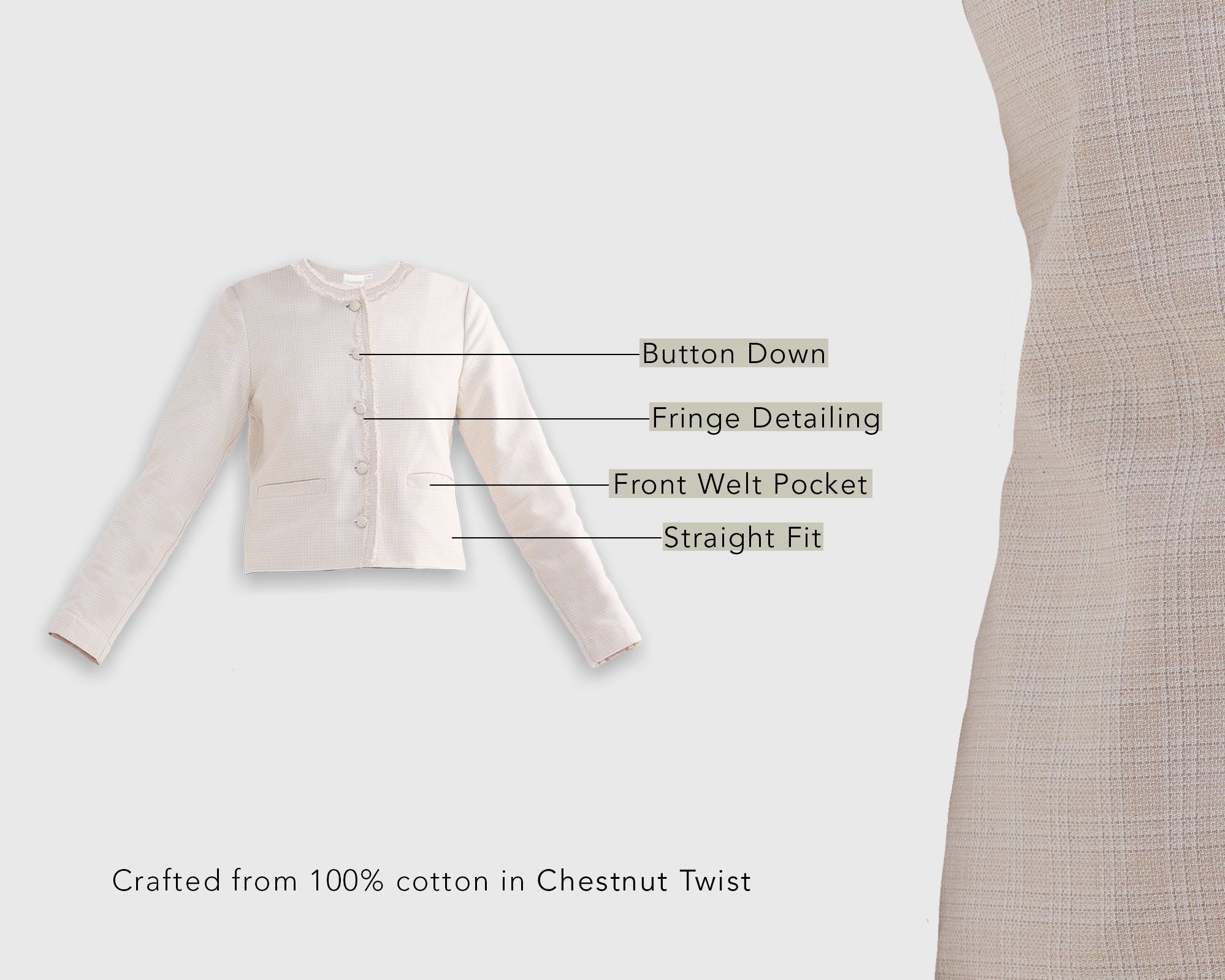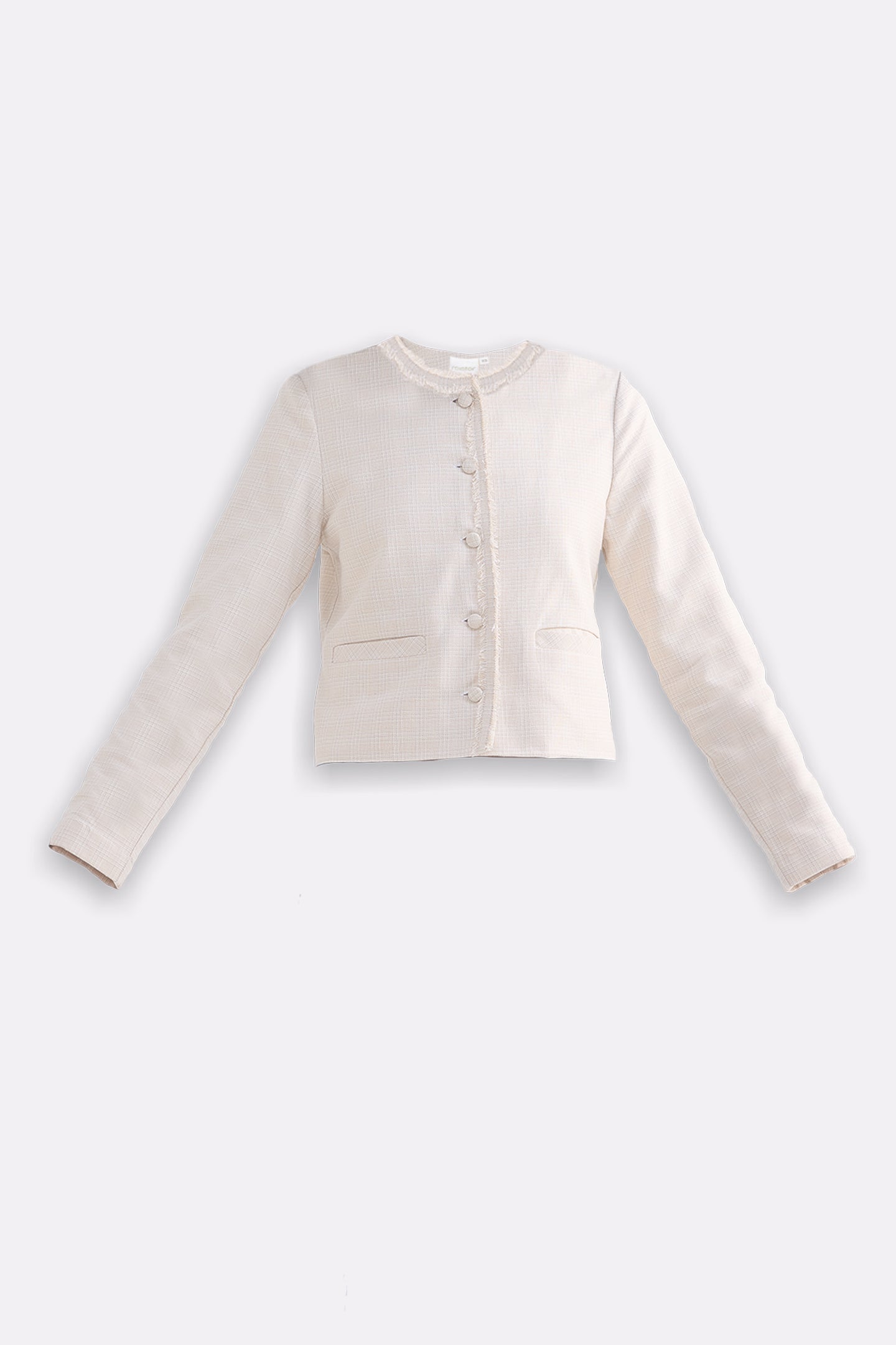 Made from high-quality cotton, this Tweed Lady Jacket flawlessly combines versatility with timeless style. The cropped look, cream color, and the front buttons give it a chic appeal - the perfect blend of comfort and elegance. Layer up your outfit with this pretty versatile jacket for a classic fall look; your new go-to piece for every occasion.