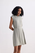 Made from an eco-friendly modal knit, this light olive dress has a lightly elasticated cinched waist for a customized and flattering fit while the side pockets offer comfort and style.