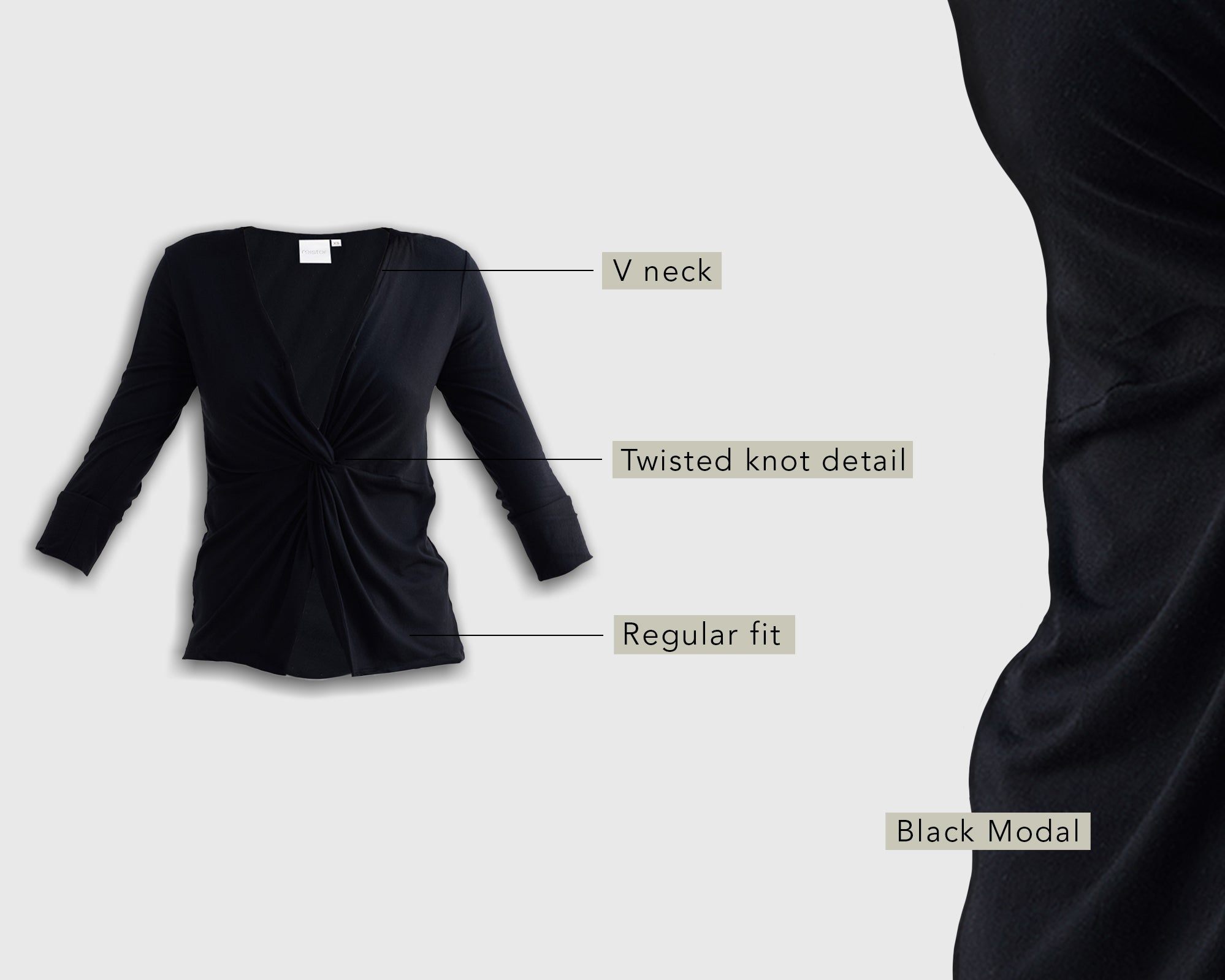 Sophisticated and chic, this black v-neck top features ¾ sleeves and a sexy and stylish front twist. Pair this with high waisted trousers to complete the look.