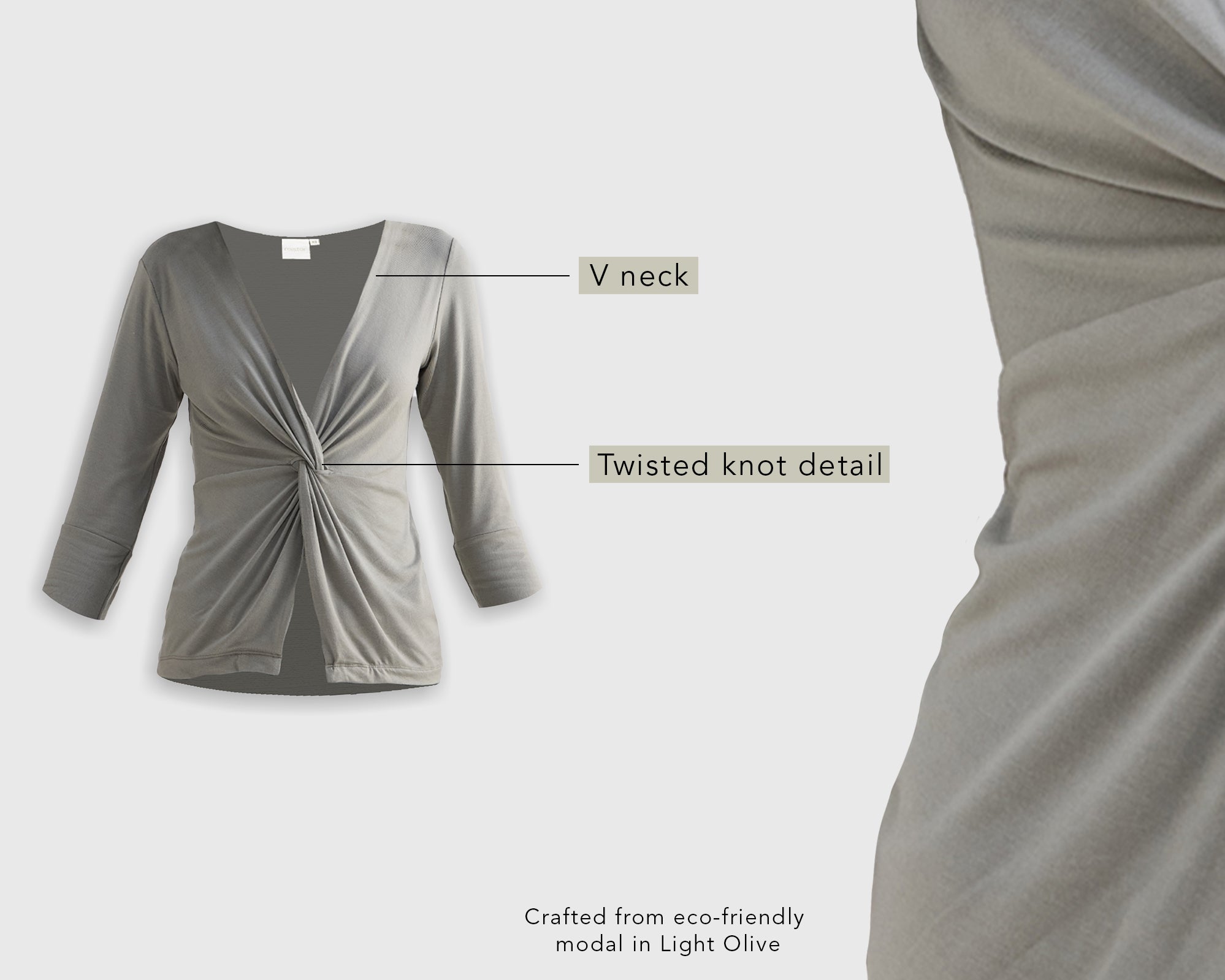 Sophisticated and chic, this light olive v-neck top features ¾ sleeves and a sexy and stylish front twist. Pair this with high waisted trousers to complete the look.