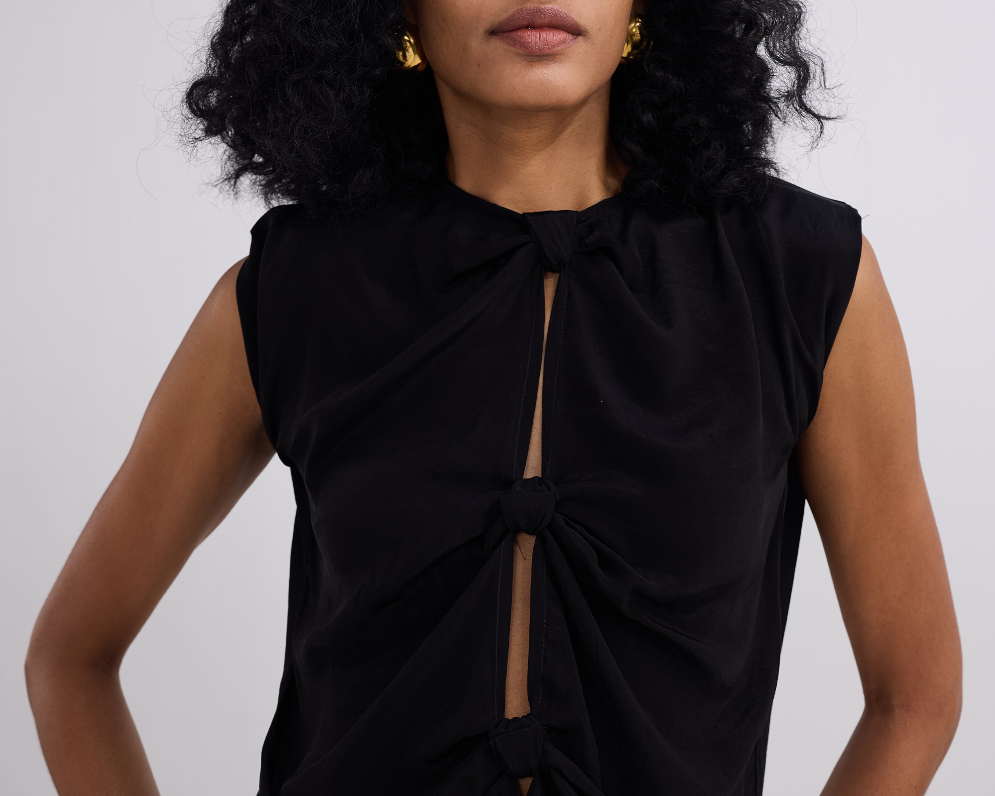 This pretty black top with chic front knots is a total wardrobe win! Chic, timeless, and versatile, dress it up for a party or keep it cool for an everyday look. This top is your new go-to for effortless style, anytime, anywhere!