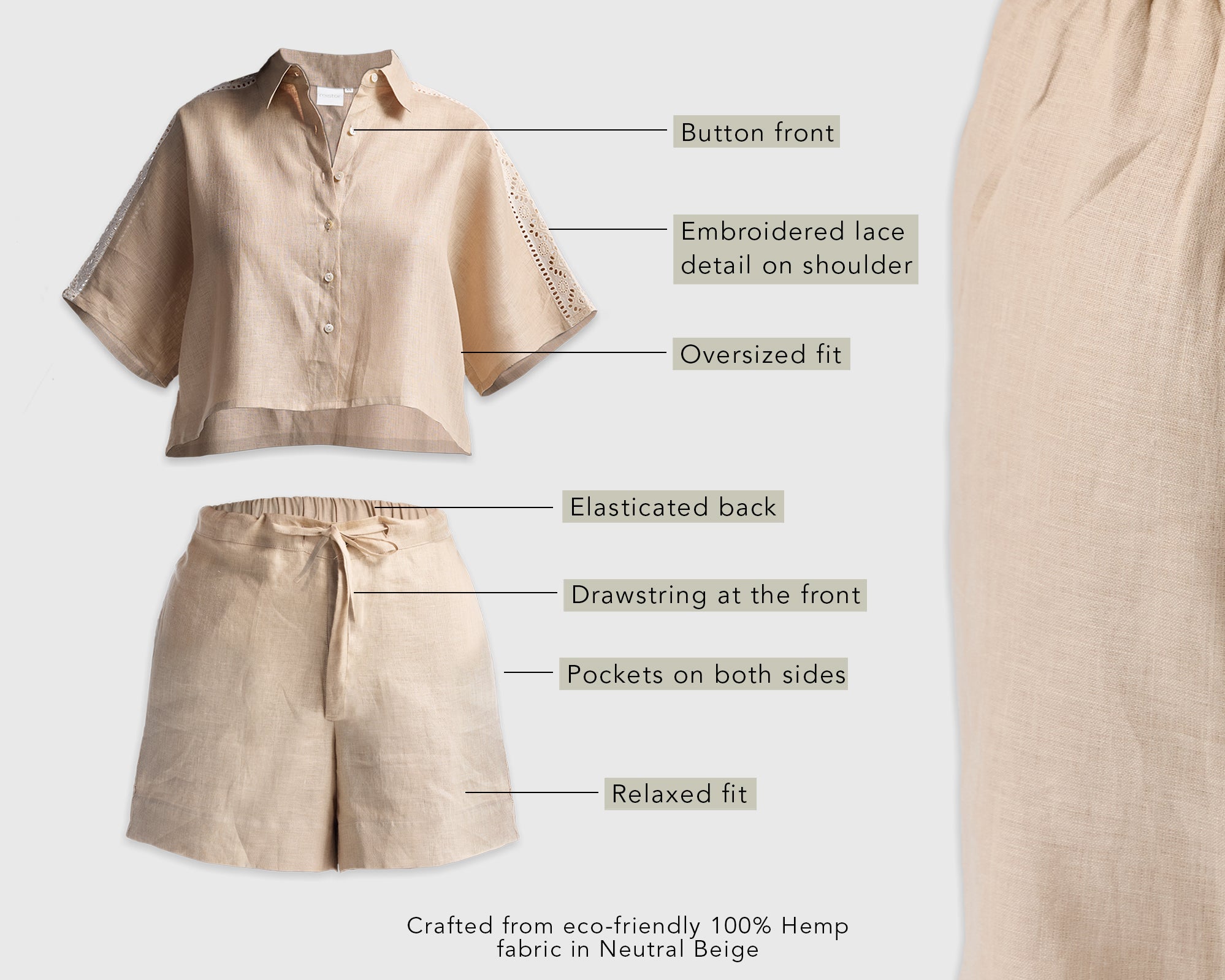 Effortlessly chic, this Boxy Shirt with Lace Set is made from 100% hemp in neutral beige. The relaxed-fit shirt features delicate lace detailing that adds an extra touch of elegance, and the adjustable drawstring shorts ensure all-day comfort. Light, breathable, and versatile, this set is your go-to for warm days and easy styling.