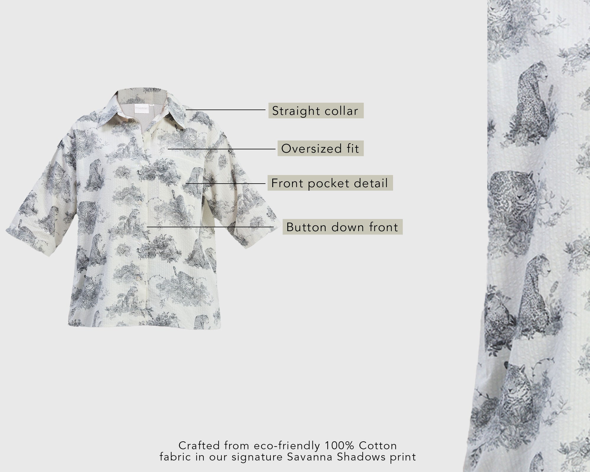 This shirt is effortlessly chic with a touch of the wild! It features a crisp straight collar , and a breezy animal print. It’s lightweight, soft, breathable, and comfy, that you’ll find yourself reaching out for this piece time-and-again. Made from lightweight, eco-friendly fabric, it’s perfect for warm days and easy layering.